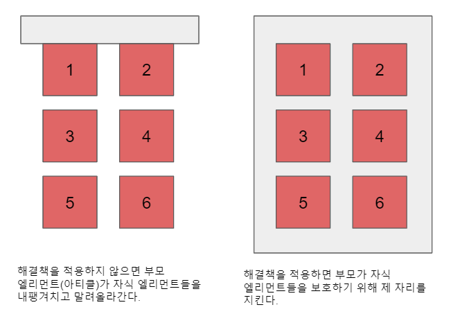이런 '기능'을 해결하고 부모가 버려진 자식 엘리먼트들을 모두 받아들이도록 강제하는 여러 가지 해결책이 개발됐지만 이 두 가지 해결책이 가장 안정적이다. 첫 번째 해결책은 HTML구조를 활용하는 것이고 두 번째 해결책은 순수 CSS만 활용하는 해결책이다.