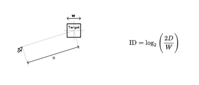 피츠는 대상 선택 작업의 난이도(ID)를 정량화하는 측정 기준도를 제시했다. 대상 중심까지의 거리(D)는 신호(signal)로, 대상의 허용 오차 혹은 너비(W)는 잡음(noise)으로 간주한다.