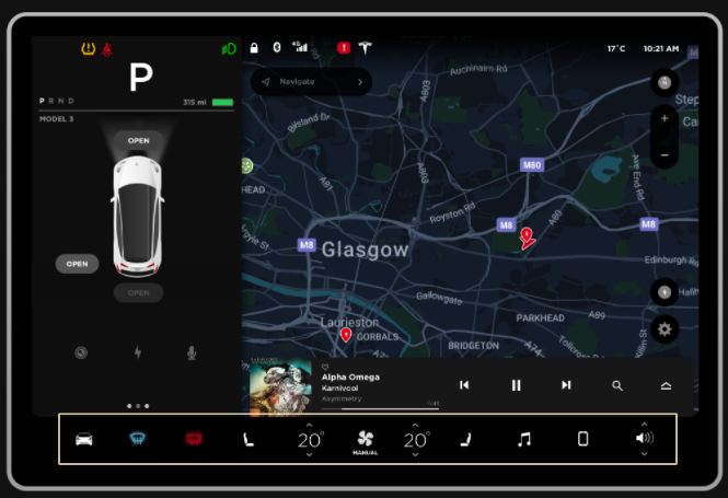 테슬라 모델 3의 하단 네비게이션 바는 피츠의 법칙을 고려해 각 항목 사이에 충분한 간격을 두었다. 그 덕분에 인접한 다른 동작을 실수로 누를 위험이 감소했다.