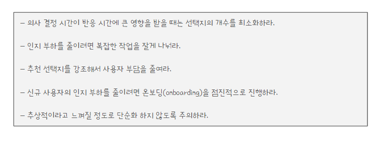 이는 인터페이스에 여러 요소가 복잡하게 얽혀있으면 사용자는 의사결정이 늦어지고 인지 부하가 늘어난다.