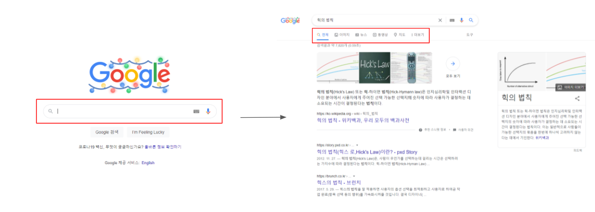 2) 구글 검색의 경우 검색결과를 전체, 동영상, 이미지, 뉴스 등 유형에 따라 필터링하는 기능을 검색 실행 이후에 표시한다.