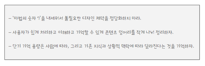 밀러의 법칙이 우리에게 전하는 교훈은 콘텐츠를 적절한 큭기의 정어리로 나눠 정리해두면 사용자가 정보를 더 쉽게 처리하고 이해하고 기억하는 데 도움이 된다는 것이다.