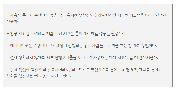 컴퓨터와 사용자가 서로를 기다리지 않아도 되는 속도(0.4초 이하)로 인터랙션하면 생산성은 급격히 높아진다.